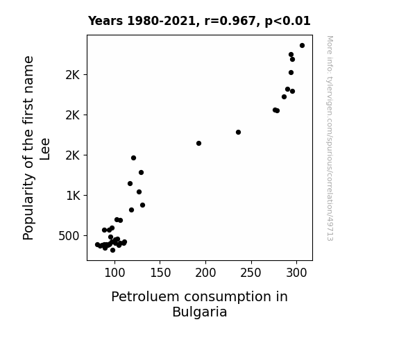 This means 93.6% of the change in the one variable (i.e., Petroluem consumption in Bulgaria) is predictable based on the change in the other (i.e., Popularity of the first name Lee) over the 42 years from 1980 through 2021.