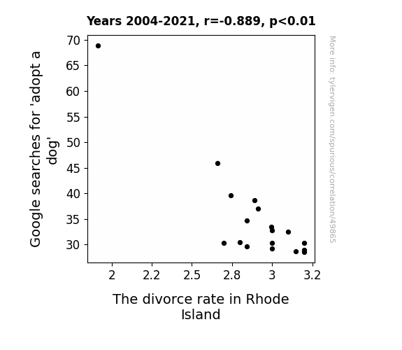 This means 79% of the change in the one variable (i.e., The divorce rate in Rhode Island) is predictable based on the change in the other (i.e., Google searches for 'adopt a dog') over the 18 years from 2004 through 2021.