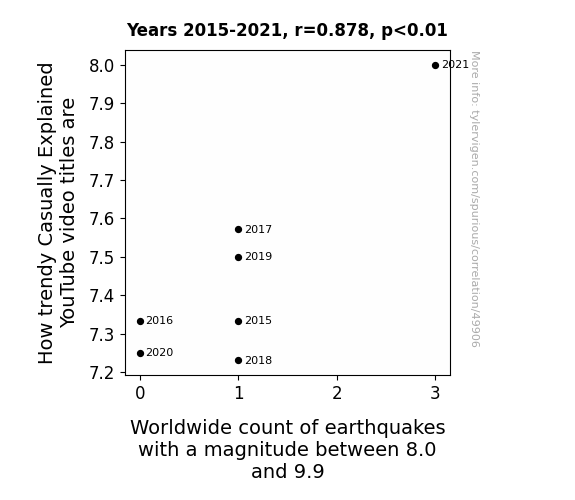 This means 77% of the change in the one variable (i.e., Worldwide count of earthquakes with a magnitude between 8.0 and 9.9) is predictable based on the change in the other (i.e., How trendy Casually Explained YouTube video titles are) over the 7 years from 2015 through 2021.