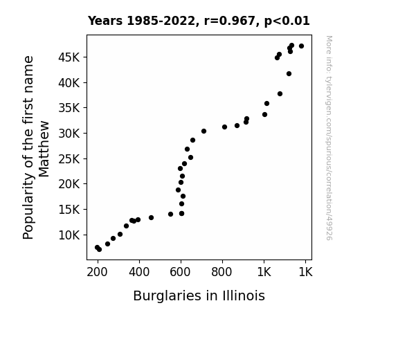 This means 93.5% of the change in the one variable (i.e., Burglaries in Illinois) is predictable based on the change in the other (i.e., Popularity of the first name Matthew) over the 38 years from 1985 through 2022.