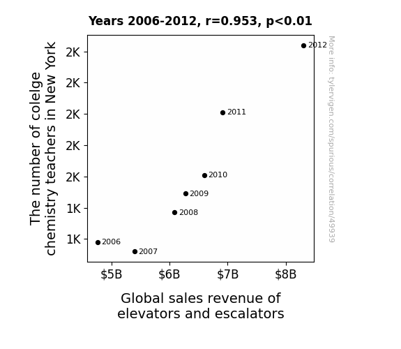 This means 90.9% of the change in the one variable (i.e., Global sales revenue of elevators and escalators) is predictable based on the change in the other (i.e., The number of colelge chemistry teachers in New York) over the 7 years from 2006 through 2012.