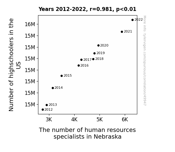 This means 96.3% of the change in the one variable (i.e., The number of human resources specialists in Nebraska) is predictable based on the change in the other (i.e., Number of highschoolers in the US) over the 11 years from 2012 through 2022.