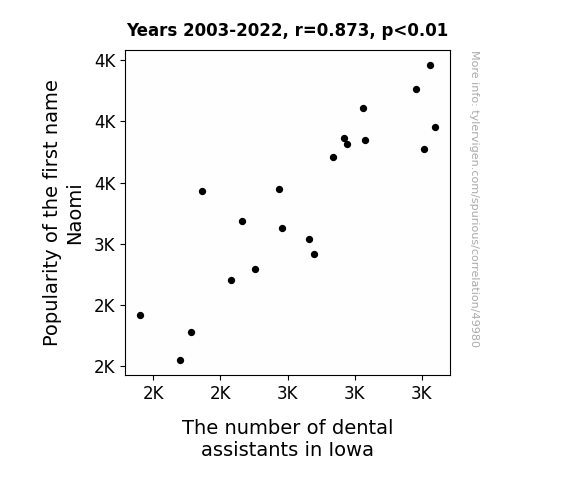This means 76.2% of the change in the one variable (i.e., The number of dental assistants in Iowa) is predictable based on the change in the other (i.e., Popularity of the first name Naomi) over the 20 years from 2003 through 2022.