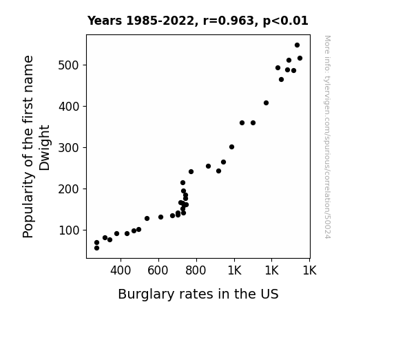 This means 92.8% of the change in the one variable (i.e., Burglary rates in the US) is predictable based on the change in the other (i.e., Popularity of the first name Dwight) over the 38 years from 1985 through 2022.
