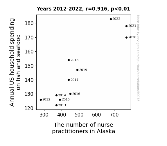 This means 83.9% of the change in the one variable (i.e., The number of nurse practitioners in Alaska) is predictable based on the change in the other (i.e., Annual US household spending on fish and seafood) over the 11 years from 2012 through 2022.
