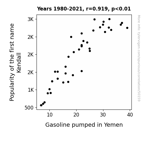 This means 84.5% of the change in the one variable (i.e., Gasoline pumped in Yemen) is predictable based on the change in the other (i.e., Popularity of the first name Kendall) over the 42 years from 1980 through 2021.
