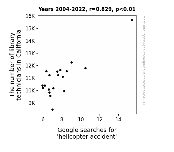 This means 68.8% of the change in the one variable (i.e., Google searches for 'helicopter accident') is predictable based on the change in the other (i.e., The number of library technicians in California) over the 19 years from 2004 through 2022.