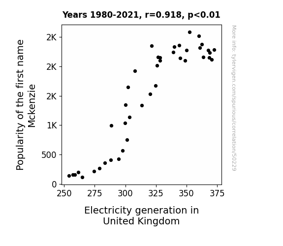 This means 84.2% of the change in the one variable (i.e., Electricity generation in United Kingdom) is predictable based on the change in the other (i.e., Popularity of the first name Mckenzie) over the 42 years from 1980 through 2021.