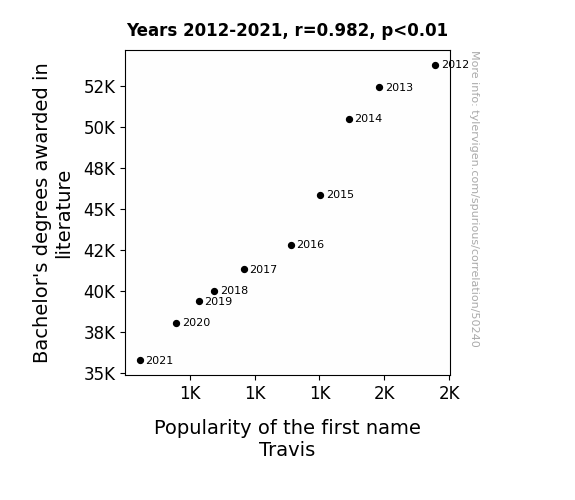 This means 96.4% of the change in the one variable (i.e., Popularity of the first name Travis) is predictable based on the change in the other (i.e., Bachelor's degrees awarded in literature) over the 10 years from 2012 through 2021.