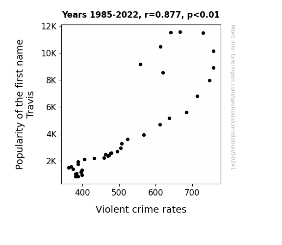 This means 76.9% of the change in the one variable (i.e., Violent crime rates) is predictable based on the change in the other (i.e., Popularity of the first name Travis) over the 38 years from 1985 through 2022.