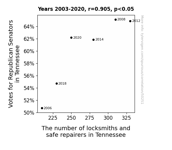 This means 82% of the change in the one variable (i.e., The number of locksmiths and safe repairers in Tennessee) is predictable based on the change in the other (i.e., Votes for Republican Senators in Tennessee) over the 6 years from 2003 through 2020.