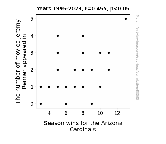 This means 20.7% of the change in the one variable (i.e., Season wins for the Arizona Cardinals) is predictable based on the change in the other (i.e., The number of movies Jeremy Renner appeared in) over the 29 years from 1995 through 2023.