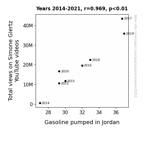 This means 93.8% of the change in the one variable (i.e., Gasoline pumped in Jordan) is predictable based on the change in the other (i.e., Total views on Simone Giertz's YouTube videos) over the 8 years from 2014 through 2021.