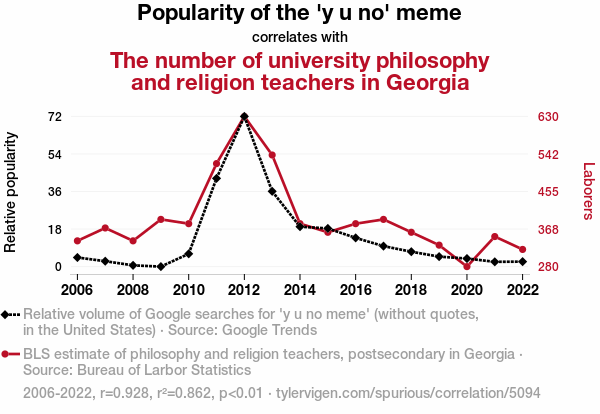 This means 86.2% of the change in the one variable (i.e., The number of university philosophy and religion teachers in Georgia) is predictable based on the change in the other (i.e., Popularity of the 'y u no' meme) over the 17 years from 2006 through 2022.