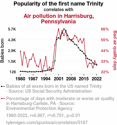 This means 75.1% of the change in the one variable (i.e., Air pollution in Harrisburg, Pennsylvania) is predictable based on the change in the other (i.e., Popularity of the first name Trinity) over the 43 years from 1980 through 2022.