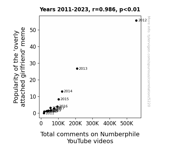 User prompt: Please provide potential search keywords for a paper titled Obsessively Attached to View Counts: A Meme-tic Analysis of 'Overly Attached Girlfriend' Popularity and Total Comments on Numberphile YouTube Videos with an abstract of In this study, we delve into the entangled web of internet culture and online engagement to explore the unexpected link between the widespread circulation of the 'overly attached girlfriend' meme and the total comments on Numberphile YouTube videos. Utilizing data from Google Trends and YouTube, our research team uncovered a remarkably strong correlation, with a coefficient of 0.9861359 and p < 0.01, from the year 2011 to 2023. It seems that the meme has woven itself seamlessly into the fabric of online communities, eliciting a rise in commentary akin to a spider's web attracting flies.