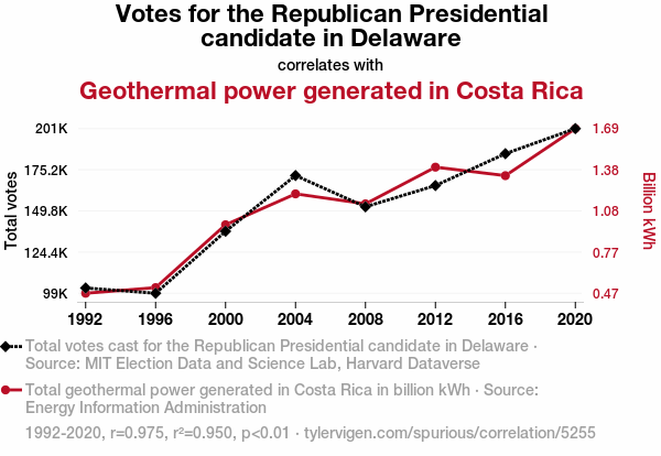 This means 95% of the change in the one variable (i.e., Geothermal power generated in Costa Rica) is predictable based on the change in the other (i.e., Votes for the Republican Presidential candidate in Delaware) over the 8 years from 1992 through 2020.