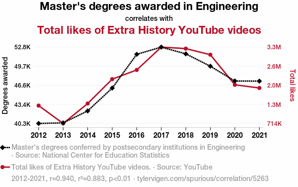 This means 88.3% of the change in the one variable (i.e., Total likes of Extra History YouTube videos) is predictable based on the change in the other (i.e., Master's degrees awarded in Engineering) over the 10 years from 2012 through 2021.