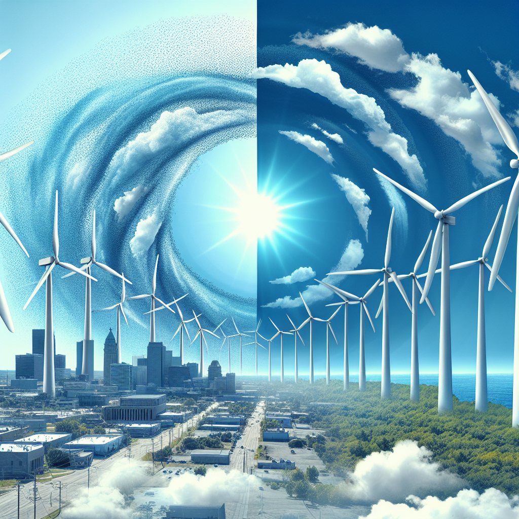 User prompt: Please respond with an image generation prompt that would be likely to create an interesting visual using DALLE-3, using the following style: [ A photo-realistic image ] and depicting this scene: In Tulsa, Oklahoma, the air quality index shows a significant improvement with clear blue skies and fresh air. Meanwhile, in Puerto Rico, wind turbines are spinning vigorously, generating abundant wind power. The cleaner air in Tulsa has sparked a chain of breezy benefits, leading to stronger winds in Puerto Rico, where the wind energy production is thriving. Keep the visual depiction simple. Do not include any words or speech bubbles.