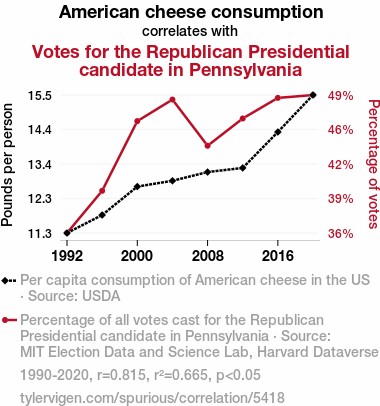 - The spurious research paper: Aged Cheddar and Red States: A Cheesy Correlation Between American Cheese Consumption and Republican Votes in Pennsylvania