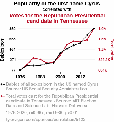 User prompt: Please provide potential search keywords for a paper titled Cyrus, Conservatism, and Correlation: A Comical Connection with an abstract of In our wacky yet wonderfully scientific study, we delved into the fascinating relationship between the popularity of the first name Cyrus and the votes for the Republican Presidential candidate in Tennessee. With the help of data from the US Social Security Administration and MIT Election Data and Science Lab, Harvard Dataverse, we set out to quench our thirst for knowledge and fun facts. Lo and behold, we discovered a remarkably high correlation coefficient of 0.9673898 and p < 0.01 for the years 1976 to 2020. Our findings suggest that there is a considerable connection between individuals named Cyrus and their tendency to lean towards conservative voting patterns in the Volunteer State. So, the next time you meet a Cyrus from Tennessee, just remember that they may be part of a statistical trend that's right-leaning!