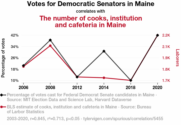 This means 71.3% of the change in the one variable (i.e., The number of cooks, institution and cafeteria in Maine) is predictable based on the change in the other (i.e., Votes for Democratic Senators in Maine) over the 6 years from 2003 through 2020.
