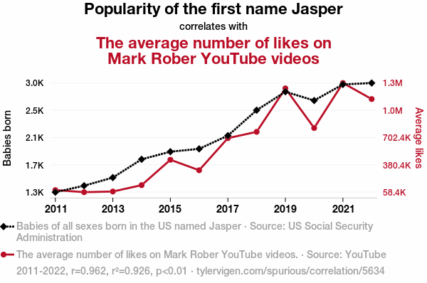 - The spurious research paper: Jasper-ity Likes Rober: A Quantitative Analysis of the Relationship Between the Name Jasper and Mark Rober YouTube Video Likes