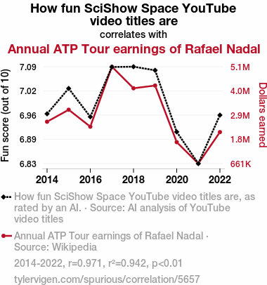 User prompt: Please make up a funny explanation for how increases in How fun SciShow Space YouTube video titles are positively influenced Annual ATP Tour earnings of Rafael Nadal.
