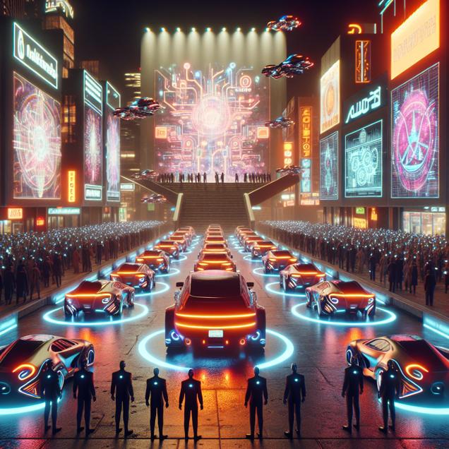 ChatGPT: Generate an image of a bustling futuristic city street in Idaho, featuring high-tech cars lining up for repairs. The vehicles should exude a sleek, futuristic design, with advanced features and holographic displays. The scene is illuminated by neon lights and hovering drones capturing the enthusiastic crowds of Libertarian supporters. The street should be adorned with futuristic political banners and billboards showcasing messages of freedom and autonomy. The atmosphere is charged with excitement, symbolizing the intersection of politics and technological advancement in a sci-fi fantasy setting. The image should capture the essence of a society on the brink of a transformative political shift, interwoven with the futuristic elements of the rapidly evolving automotive industry.