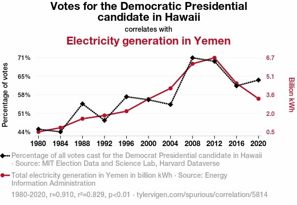 - The spurious research paper: Democratic Dilemma: Discovering the Dubious Connection Between Democrat Votes in Hawaii and Electricity Generation in Yemen