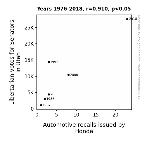 User prompt: Please provide potential search keywords for a paper titled Liberty in the Garage: A Quirky Connection Between Libertarian Votes in Utah and Honda Recalls with an abstract of In a whimsical exploration of seemingly unrelated phenomena, this study delves into the intriguing relationship between the number of Libertarian votes for Senators in Utah and the occurrence of automotive recalls issued by Honda. Using data gathered from the MIT Election Data and Science Lab, Harvard Dataverse, and US DOT, our research team conducted a thorough analysis from 1976 to 2018. Surprisingly, a strong correlation coefficient of 0.9096964 was found, with a p-value of less than 0.05, suggesting a statistically significant relationship between these two variables. While causation cannot be inferred from this correlation, the findings of this research serve as a reminder that hidden connections may exist in the most unexpected places – even between politics and car troubles. This study aims to shed light on this whimsical link and contribute to the growing body of interdisciplinary research, leaving readers with both laughter and food for thought.