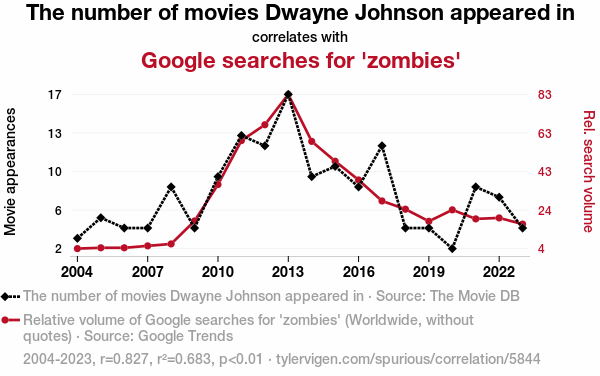 - The spurious research paper: The Rock & The Undead: A Correlation Study Between Dwayne Johnson's Movie Appearances and Google Searches for 'Zombies'