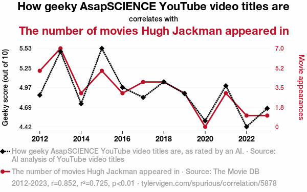 User prompt: Please make up a funny explanation for how increases in How geeky AsapSCIENCE YouTube video titles are positively influenced The number of movies Hugh Jackman appeared in.