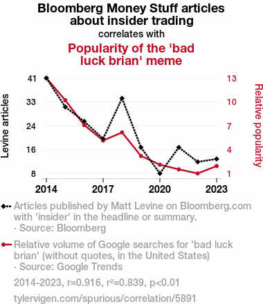 In summary, the correlation between Bloomberg Money Stuff articles about insider trading and the popularity of the 'bad luck brian' meme is a captivating testament to the interconnectedness of seemingly disparate realms. This unexpected relationship prompts introspection on the interplay between high finance and internet humor, challenging us to reconsider the boundaries and intersections of knowledge dissemination in the digital age.