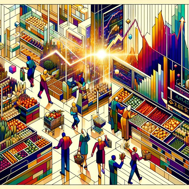User prompt: Please respond with an image generation prompt that would be likely to create an interesting visual using DALLE-3, using the following style: [ inspired by bauhaus ] and depicting this scene: In a bustling Whole Foods store, customers are seen with beaming smiles as they pick up their premium groceries. Meanwhile, a digital display board prominently shows the rising London Gold Prices, adding a glint of excitement to the air. The customers' satisfaction seems to mirror the golden uptick, creating an atmosphere of wealth and contentment. Keep the visual depiction simple. Do not include any words or speech bubbles.