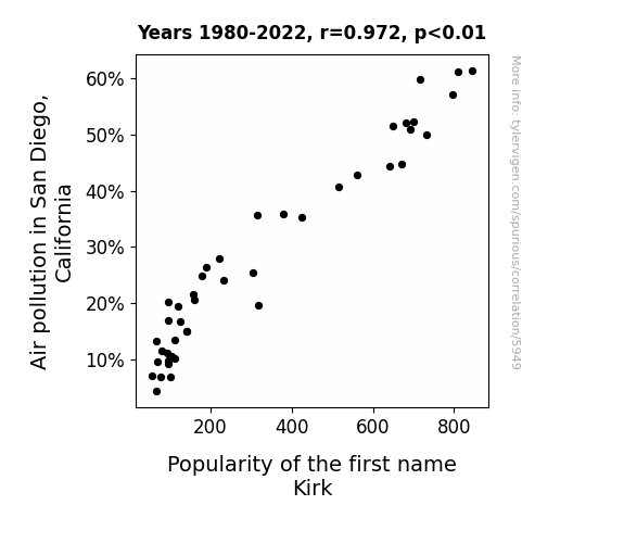 This means 94.5% of the change in the one variable (i.e., Popularity of the first name Kirk) is predictable based on the change in the other (i.e., Air pollution in San Diego, California) over the 43 years from 1980 through 2022.