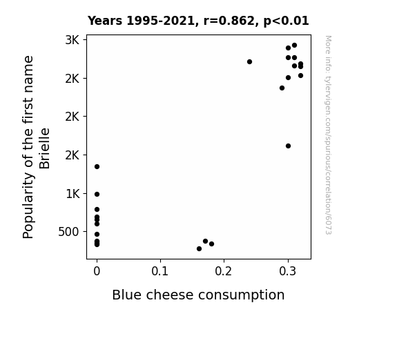 This means 74.4% of the change in the one variable (i.e., Blue cheese consumption) is predictable based on the change in the other (i.e., Popularity of the first name Brielle) over the 27 years from 1995 through 2021.