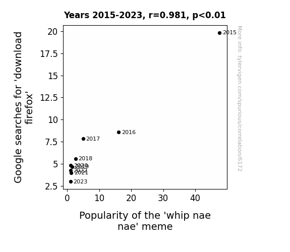 This means 96.2% of the change in the one variable (i.e., Popularity of the 'whip nae nae' meme) is predictable based on the change in the other (i.e., Google searches for 'download firefox') over the 9 years from 2015 through 2023.