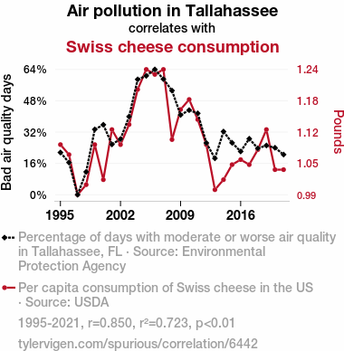 This means 72.3% of the change in the one variable (i.e., Swiss cheese consumption) is predictable based on the change in the other (i.e., Air pollution in Tallahassee) over the 27 years from 1995 through 2021.