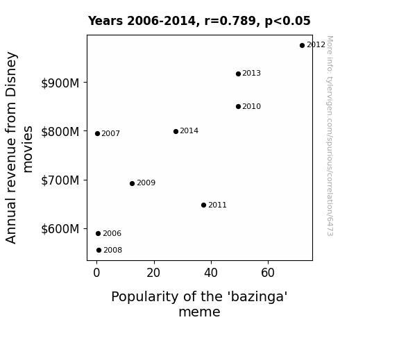 A linear line chart with years as the X-axis and two variables on the Y-axis. The first variable is Annual revenue from Disney movies and the second variable is Popularity of the 'bazinga' meme.  The chart goes from 2006 to 2014, and the two variables track closely in value over that time. Small Image