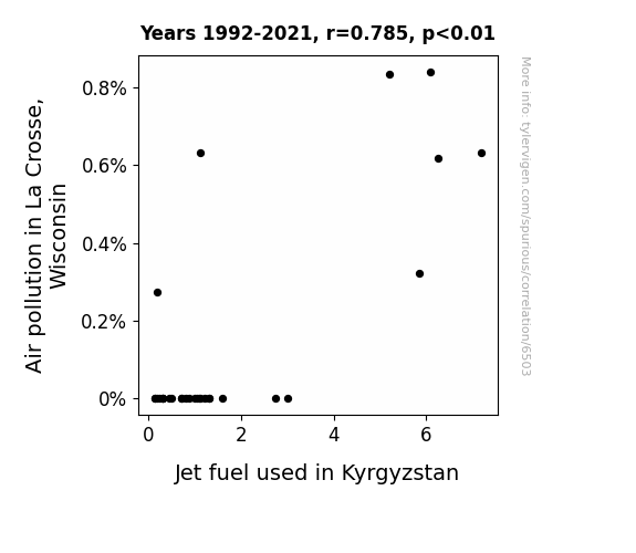 This means 61.5% of the change in the one variable (i.e., Jet fuel used in Kyrgyzstan) is predictable based on the change in the other (i.e., Air pollution in La Crosse, Wisconsin) over the 30 years from 1992 through 2021.