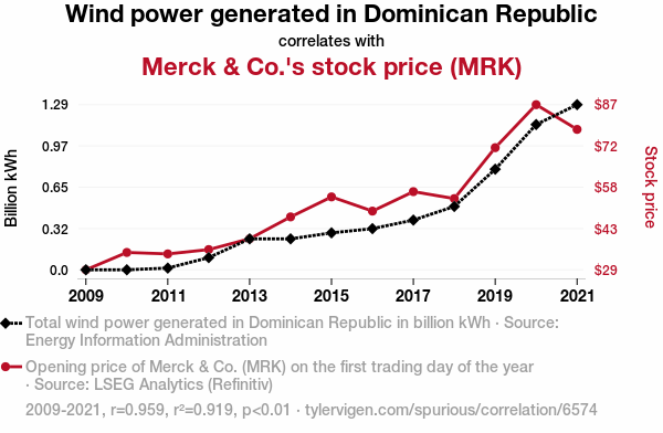This means 91.9% of the change in the one variable (i.e., Merck & Co.'s stock price (MRK)) is predictable based on the change in the other (i.e., Wind power generated in Dominican Republic) over the 13 years from 2009 through 2021.