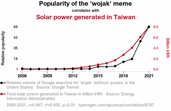 This means 93.5% of the change in the one variable (i.e., Solar power generated in Taiwan) is predictable based on the change in the other (i.e., Popularity of the 'wojak' meme) over the 16 years from 2006 through 2021.