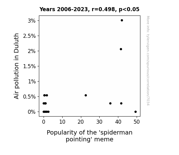 This means 24.8% of the change in the one variable (i.e., Popularity of the 'spiderman pointing' meme) is predictable based on the change in the other (i.e., Air pollution in Duluth) over the 18 years from 2006 through 2023.