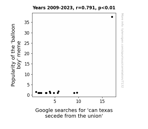 This means 62.6% of the change in the one variable (i.e., Google searches for 'can texas secede from the union') is predictable based on the change in the other (i.e., Popularity of the 'balloon boy' meme) over the 15 years from 2009 through 2023.