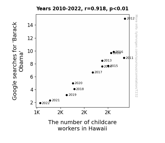 This means 84.3% of the change in the one variable (i.e., The number of childcare workers in Hawaii) is predictable based on the change in the other (i.e., Google searches for 'Barack Obama') over the 13 years from 2010 through 2022.