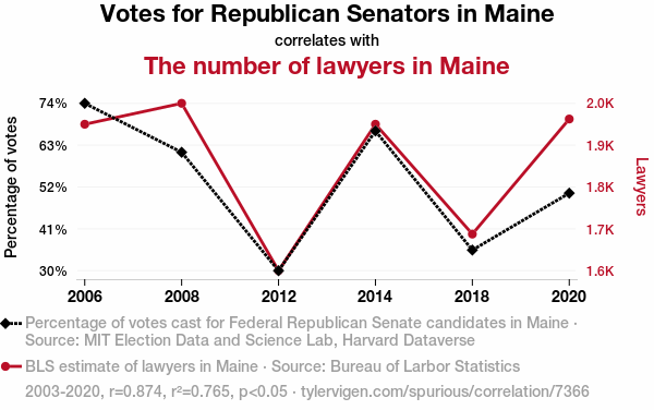 This means 76.5% of the change in the one variable (i.e., The number of lawyers in Maine) is predictable based on the change in the other (i.e., Votes for Republican Senators in Maine) over the 6 years from 2003 through 2020.