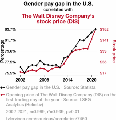 This means 93.9% of the change in the one variable (i.e., The Walt Disney Company's stock price (DIS)) is predictable based on the change in the other (i.e., Gender pay gap in the U.S.) over the 20 years from 2002 through 2021.