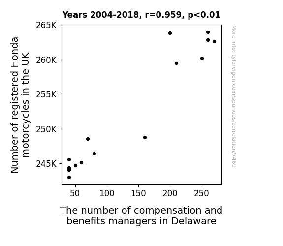 This means 91.9% of the change in the one variable (i.e., The number of compensation and benefits managers in Delaware) is predictable based on the change in the other (i.e., Number of registered Honda motorcycles in the UK) over the 15 years from 2004 through 2018.