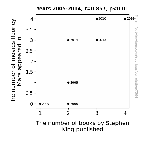 This means 73.5% of the change in the one variable (i.e., The number of books by Stephen King published) is predictable based on the change in the other (i.e., The number of movies Rooney Mara appeared in) over the 10 years from 2005 through 2014.